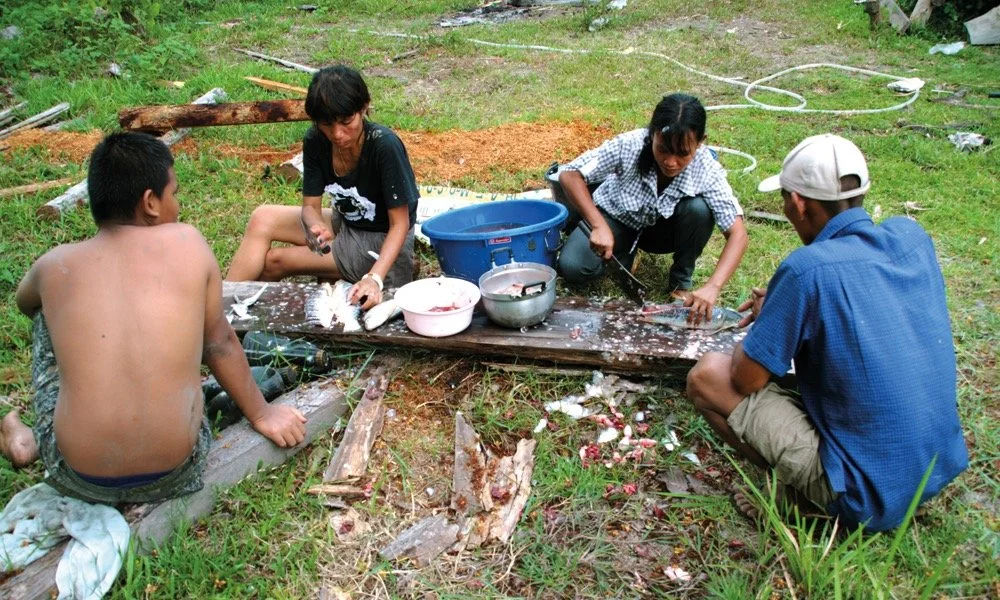 Caption: Division of labor, village-style: the men wrestled with the mud, the women turned fish into food.